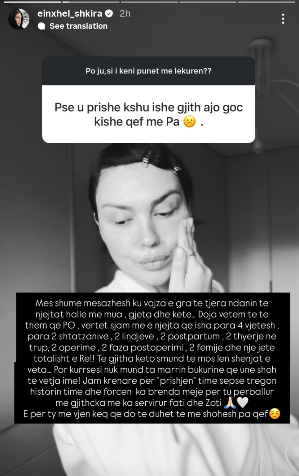 “Doja vetëm të të them që PO, vërtet s’jam më e njëjta që isha para 4 vjetësh, para 2 shtatzënive, 2 lindjeve, 2 postpartum, 2 thyerje në trup, 2 operime, 2 faza postoperimi, 2 fëmijë dhe një jetë totalisht e Re!! Të gjitha këto s’mund të mos lënë shenjat e veta…” – shkruan Einxhel.