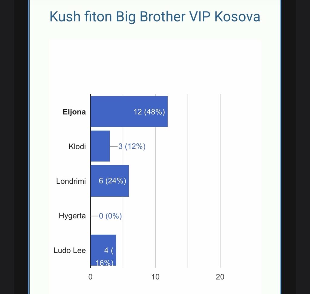 Eljona – kryeson me përqindjen më të lartë të votave Londrimi – ndjek pas me mbështetje të konsiderueshme Ludo Lee dhe Klodi – me diferencë më të vogël votash Hygerta – pa mbështetje në këtë sondazh